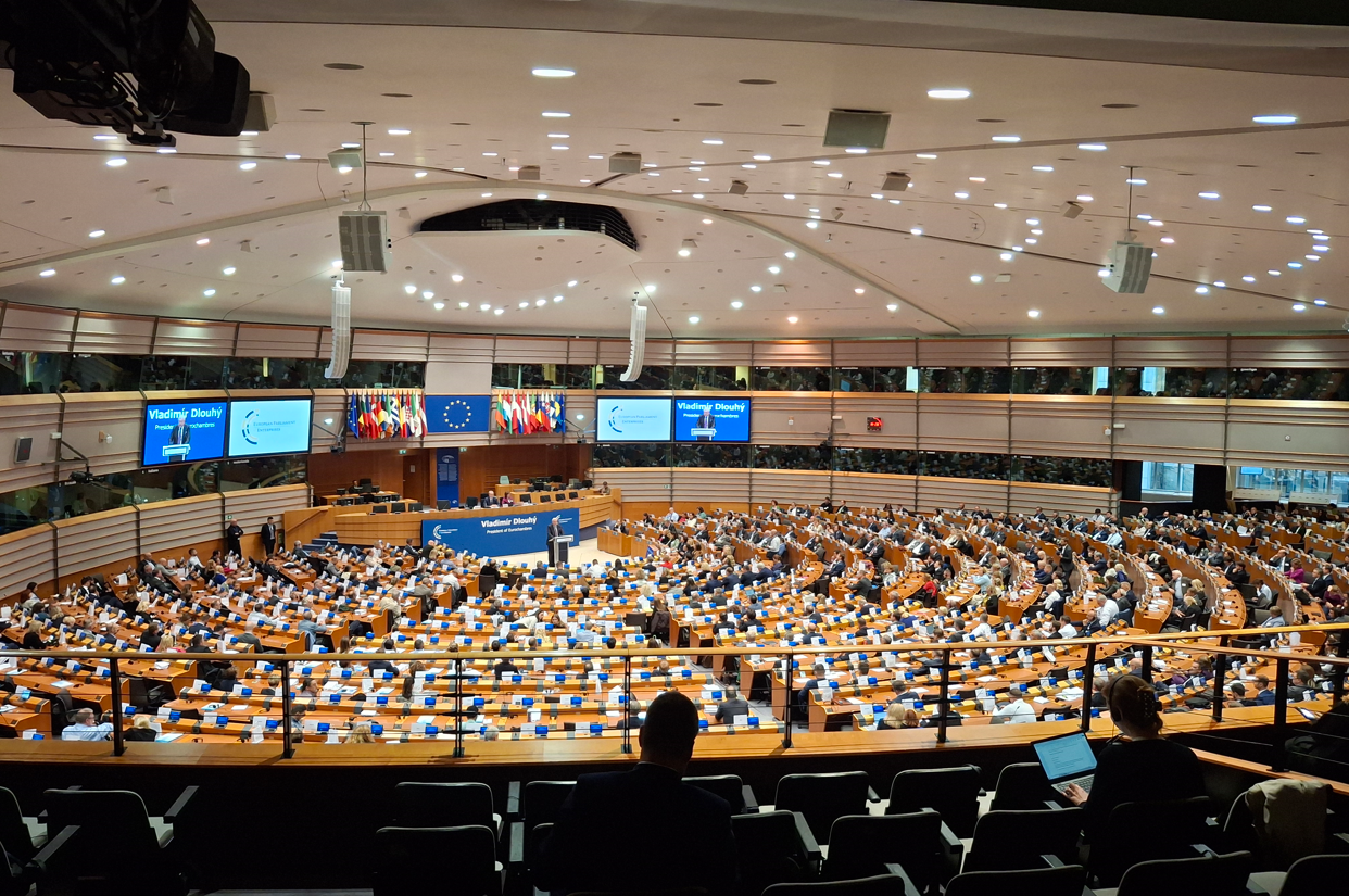 Vierailun aluksi Elsi Kataisen avustaja Taru Jokinen näytti parlamentin tiloja. Valtavassa rakennuskompleksissa työskentelee ainakin 10 000 henkilöä, mm. 720 meppiä (Euroopan parlamentin jäsen, Member of the European Parliament), heidän avustajansa (1-4 kpl / meppi), tulkit, poliittisten ryhmien työntekijät, valiokuntien sihteerit, turvahenkilöt… Brysselin lisäksi parlamentti kokoontuu 12 kertaa vuodessa Strasbourgissa Ranskassa. Parlamentin muodostaa 8 poliittista ryhmää sekä sitoutumattomat mepit. Täysistuntosaliin mahtuvat kaikki mepit sekä tulkkien työhuoneet. EU:ssa on 24 virallista kieltä, joten myös tulkkeja on paljon. Pienemmät valiokunnat kokoontuvat noin 50 hlön valiokuntasalissa.