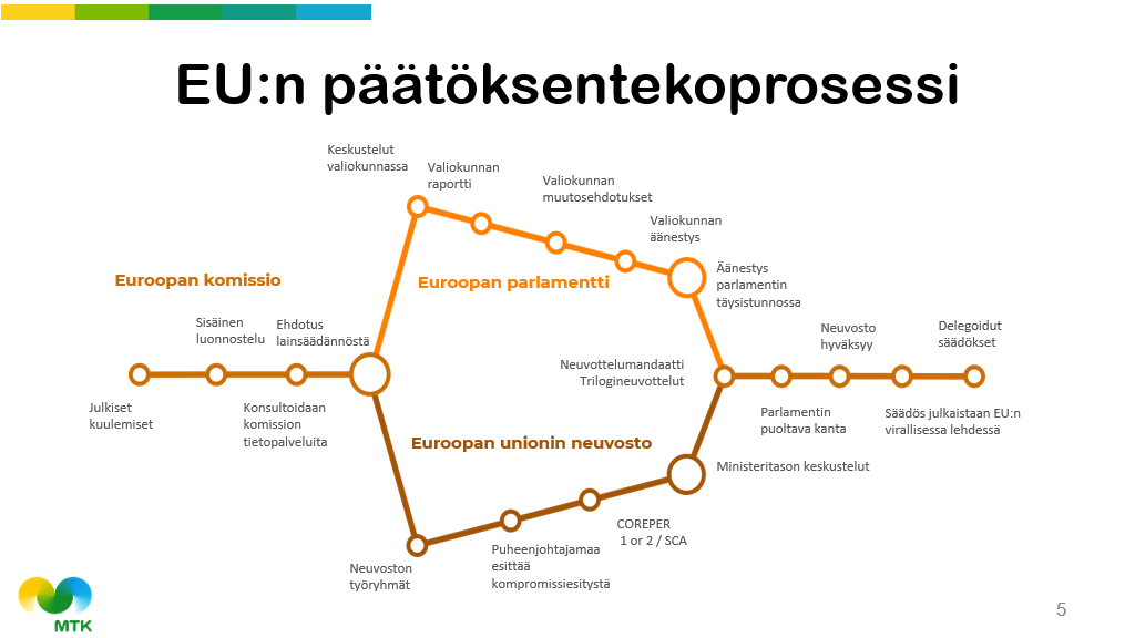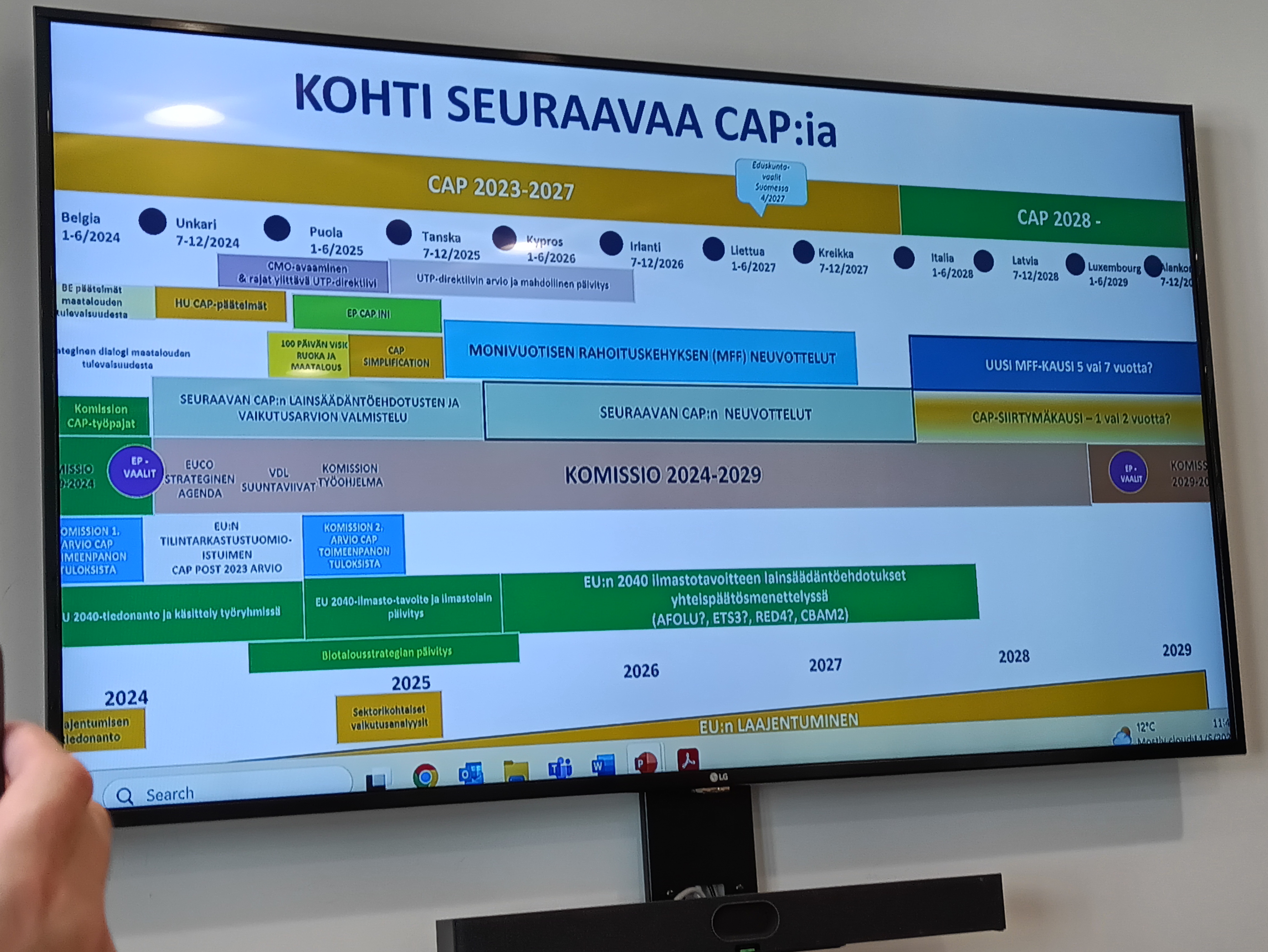 Johtokunta kommentoi, että CAPin neuvotteluaikaa on jäljellä vielä 2 vuotta, mutta kuulostaa että asialla on jo kiire, koska EU koneisto on niin moninainen. Suomen kansalliset ratkaisut ja linjat tarvitaan pikaisesti. Katainen vastasi, että kaikesta EU:n rahanjaosta tarvitaan kansalliset suunnitelmat, sektorilainsäädäntö tulee vasta sen jälkeen. Hallitus tehnee kansalliset rahoitussuunnitelmat vuoteen 2028 mennessä. Edellisellä kierroksella esitys julkaistiin 2018 ja saatiin valmiiksi 2020. Nyt esitys on tehty 2025 mutta tulossa on mm. Ranskan presidentinvaalit, jonka lopputulos voi vaikuttaa asian etenemiseen. Rahoituskehyksestä tehdään vain yksimielisiä päätöksiä, eli kaikkien on oltava samaa mieltä asiasta. Myös puheenjohtajamaalla on oma vaikutuksensa prosessin etenemiseen, suuremmilla mailla on enemmän resursseja viedä asioita eteenpäin.