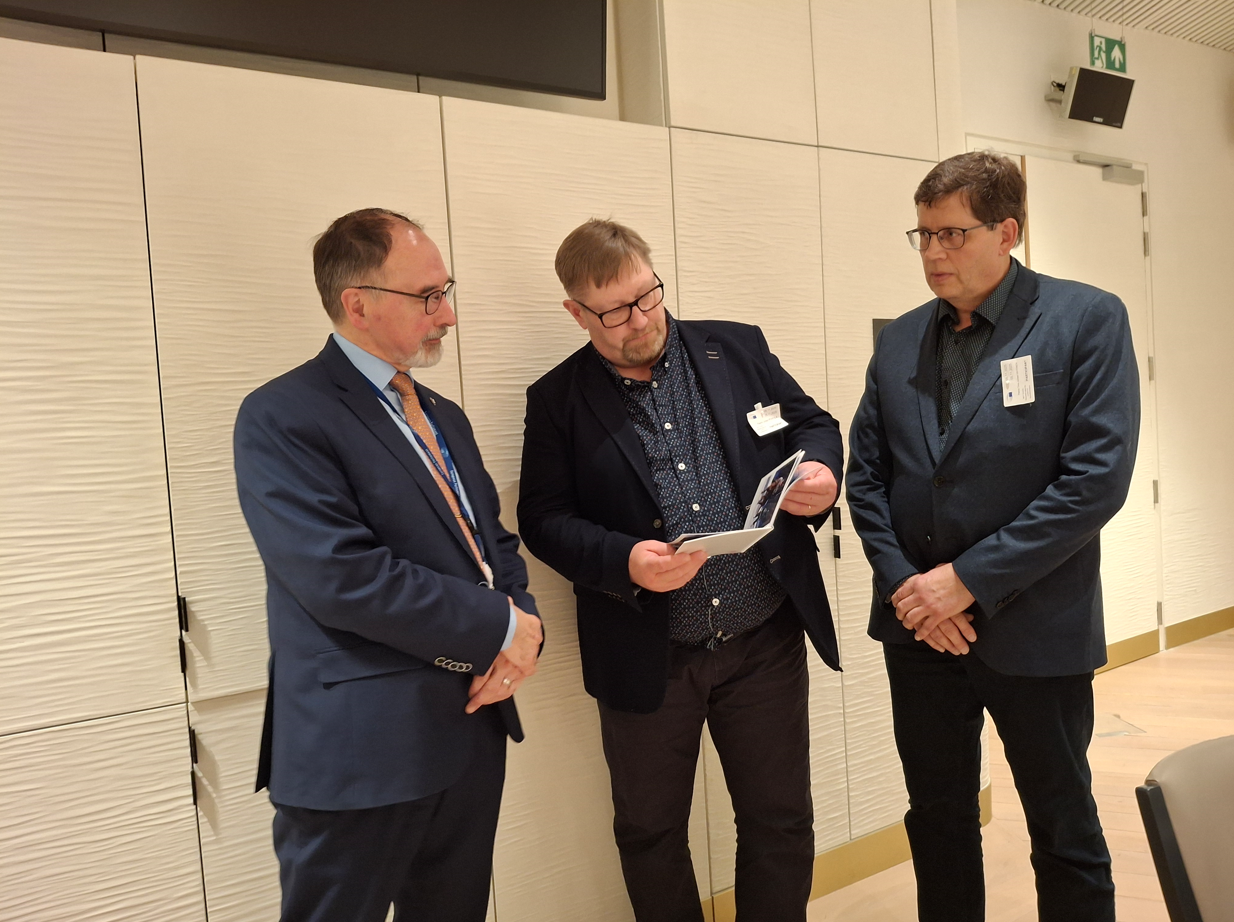Rauno Pekkola (kesk.) ja Pekka Vihtonen (oik.) kiittävät Pekka Toveria vierailun järjestymisestä.