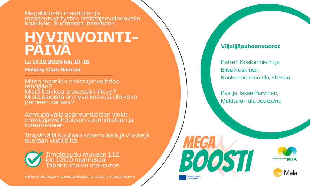 Hyvinvointia mielelle ja kropalle! Megaboosti-hankeen hyvinvointipäivässä tarjolla tiukkaa asiaa, vinkkejä tärkeisiin keskusteluihin, viljelijätarinoita sekä huumoria. Syömistäkään ei ole unohdettu ja päivän päätteeksi voi vielä oman mielen mukaan urheilla tai rentoutua kylpylässä!